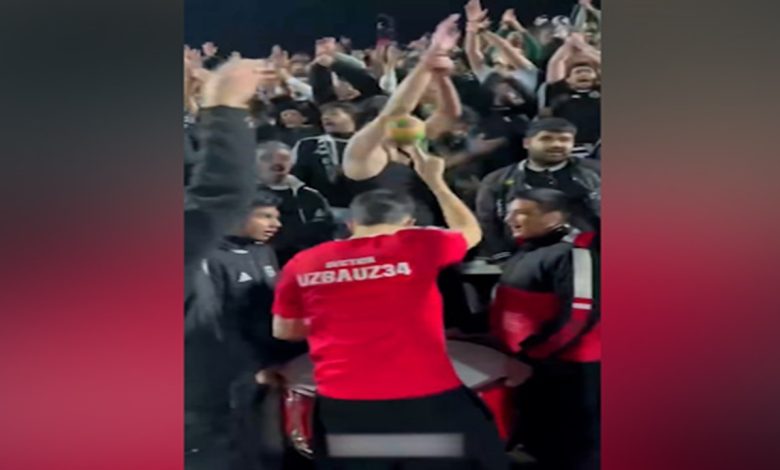 همه مگ – هواداران تراکتور دیشب در خلال بازی با چادر ملو دستهایشان را بالا بردند تا نمادی از غدیر نمایش دهند.