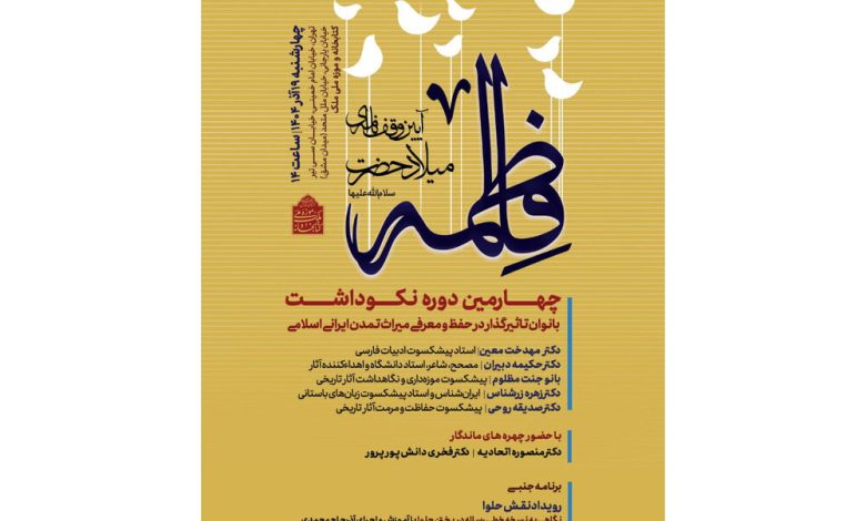 آیین «وقف‌نامه‌ای میلاد حضرت فاطمه‌ زهرا (س)» همراه با چهارمین دوره نکوداشت بانوان تأثیرگذار در حفظ و معرفی میراث تمدن ایرانی ـ اسلامی، در موزه ملی ملک برگزار می‌شود.