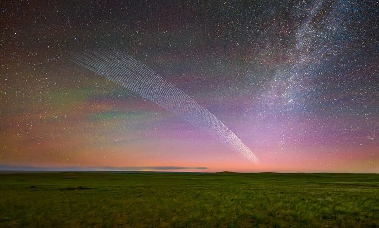 به گزارش همه مگ، آنچه در این عکس می‌بینید، دنباله به‌جامانده از یک دنباله‌دار نیست، بلکه یک توالی تایم‌لپس هوشمندانه از گروهی از ماهواره‌هاست که در ماه ژوئن در مدار زمین می‌چرخیدند.